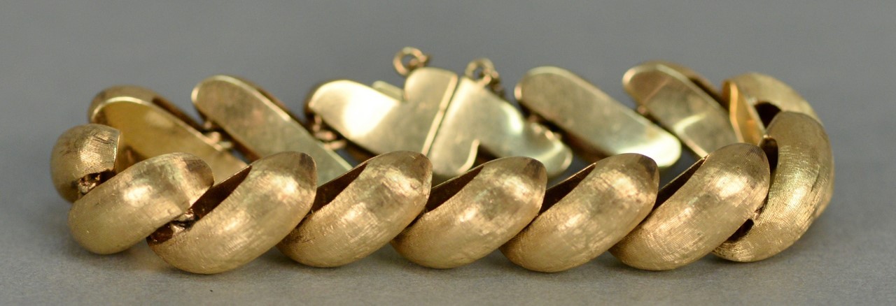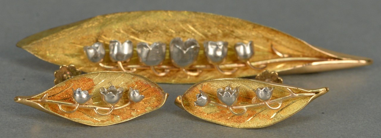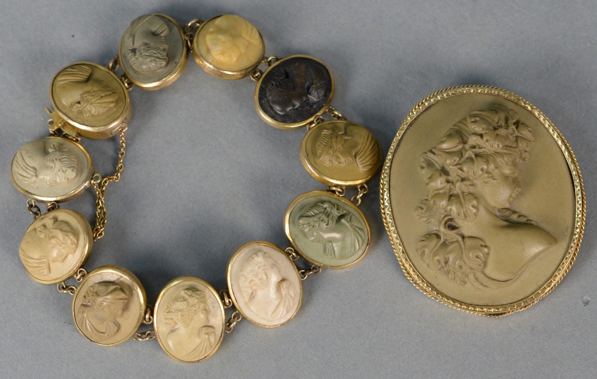 Victorian Lava cameo set, bust of a woman brooch pin with gold case and a bracelet with eleven small cameos of different colors including black, white, green, and tan.