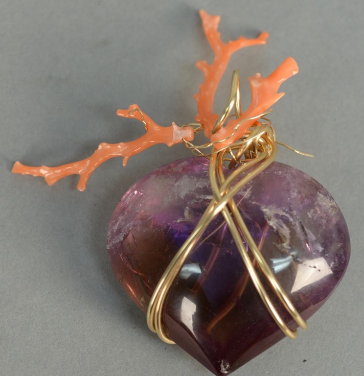 Gold Amethyst and coral large pendant by Kazuk, amethyst heart shaped pendant wrapped with gold wire and three pieces coral, Shima Kozuka Designer.