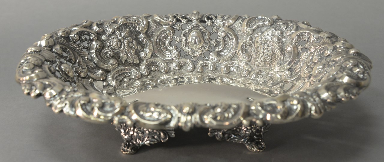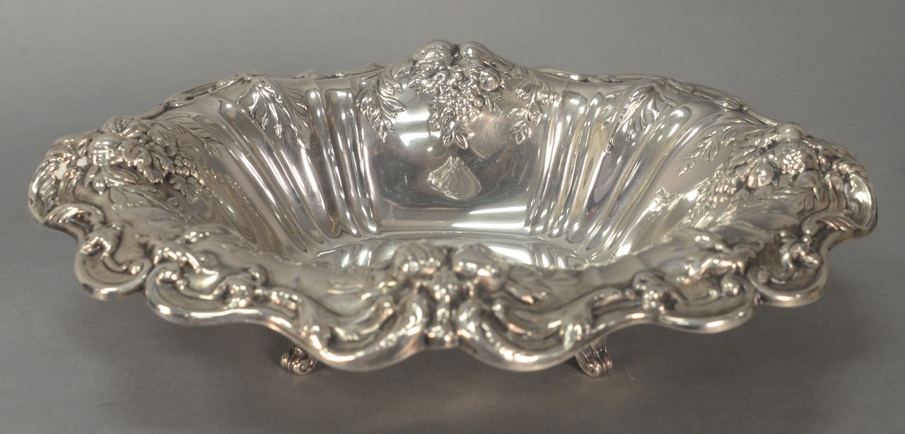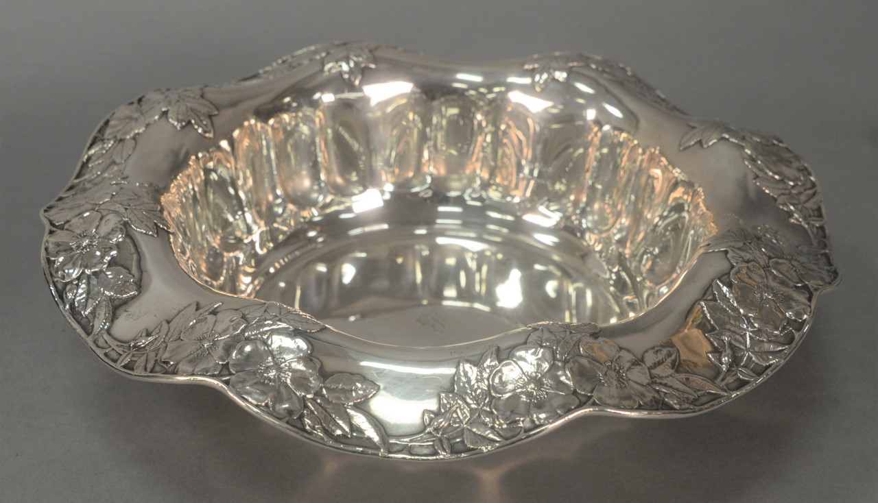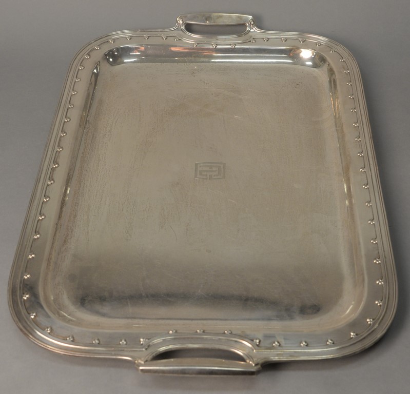 Tiffany sterling silver tray, St. Dunstan pattern with two handles, marked Tiffany & Co. Makers 15887-1520, monogrammed in middle. wd. 28 1/2in. 221 t oz.