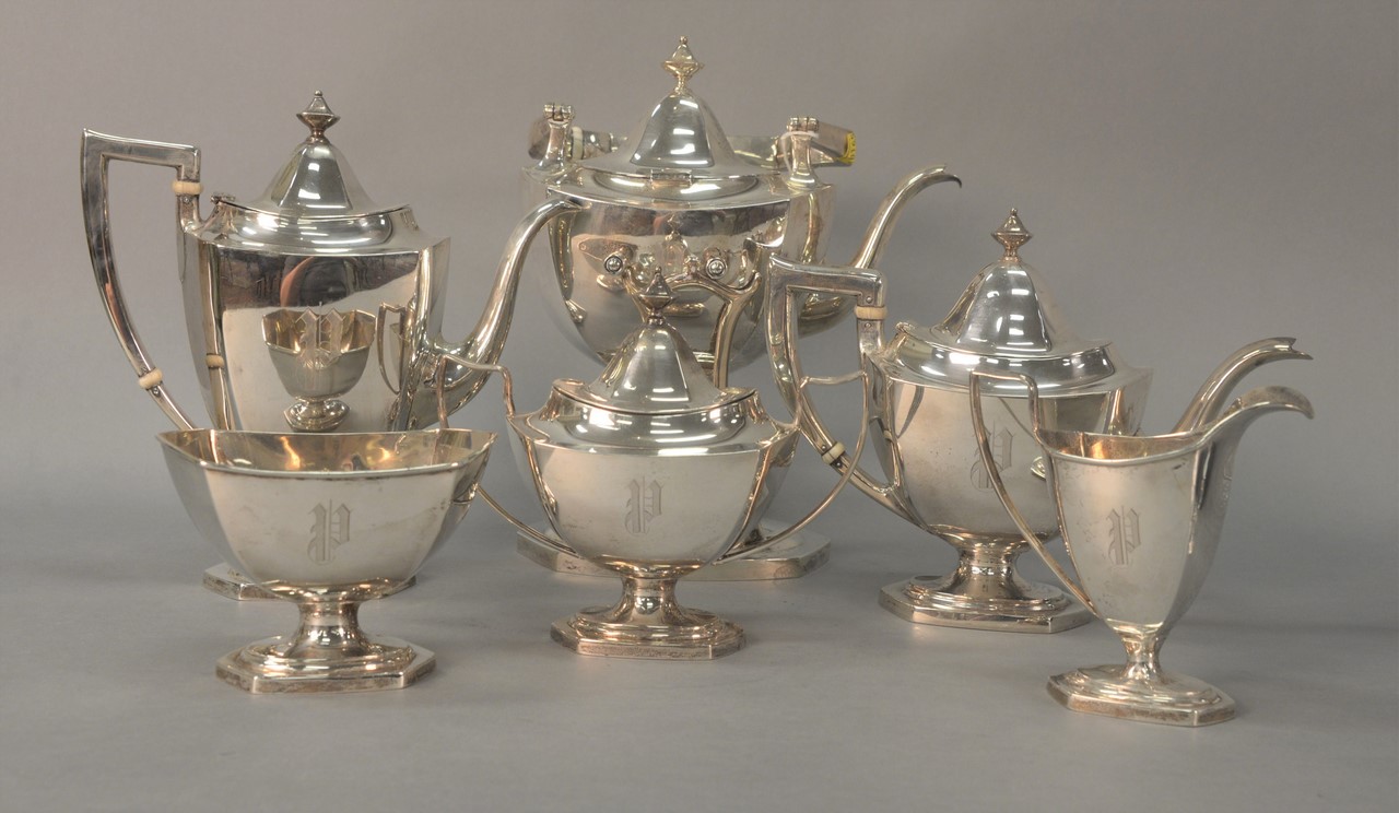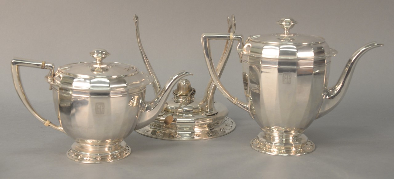 Three piece Tiffany & Co. sterling silver including St. Dunstan pattern tea pot and coffee pot, and a stand for kettle marked Tiffany & Co. Makers 13886 sterling silver 925-1000 sm. monogrammed. tea pot: ht. 5 1/2in., 2 pints 8 cups coffee pot: ht. 7 1/2in., 2 1/2 pints 80.9 t oz.