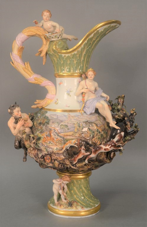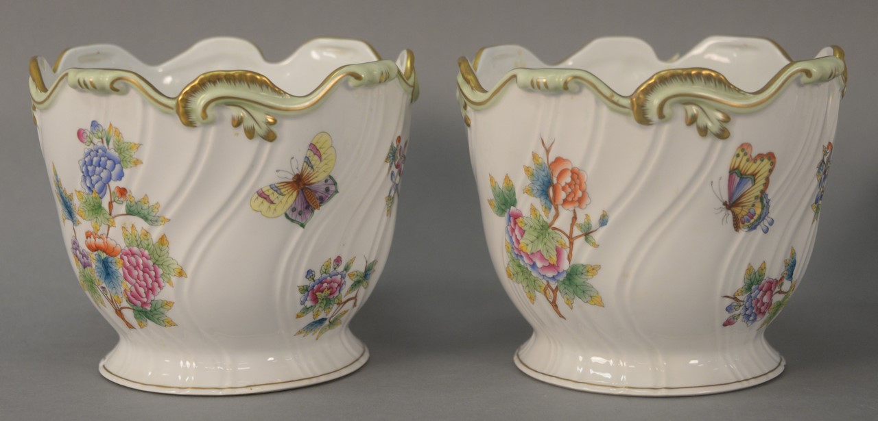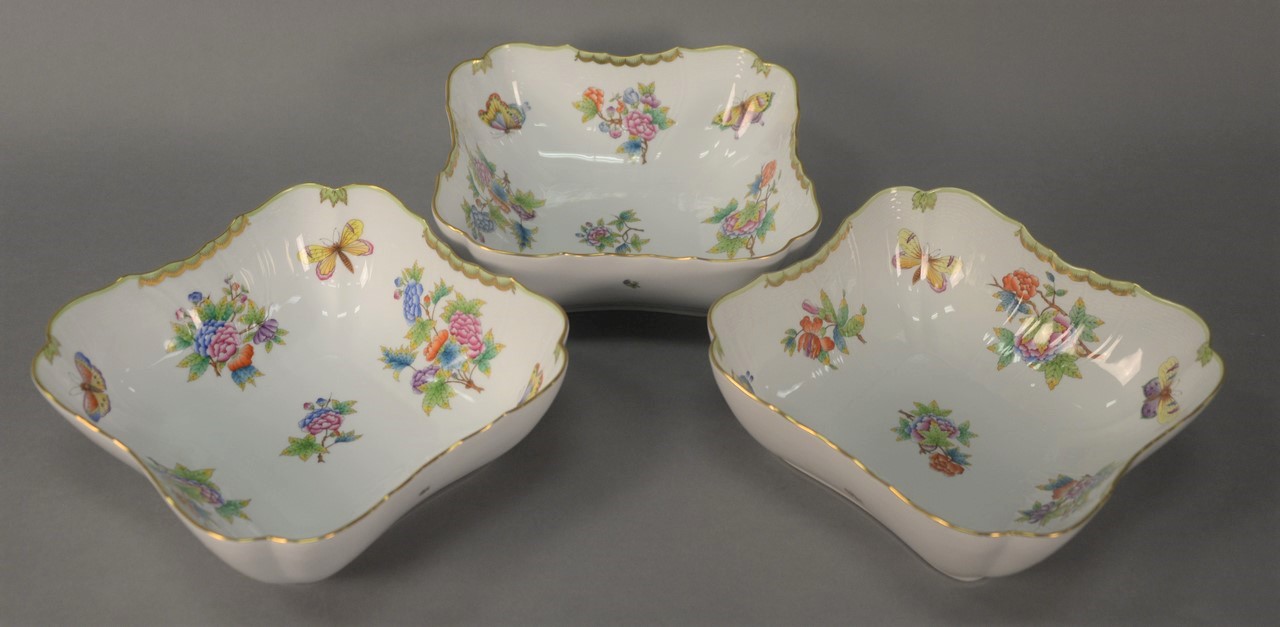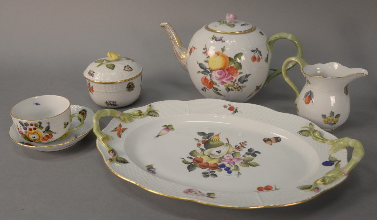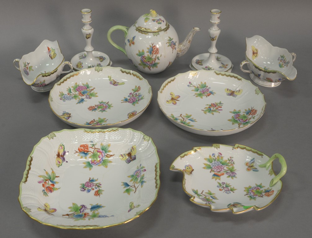 Nine piece Herend Queen Victoria table articles including 2 deep plates, 1 round, 1 square shaped dish, pair of sauce boats, pair of candlesticks, and covered teapot. largest: ht. 10 3/4in.