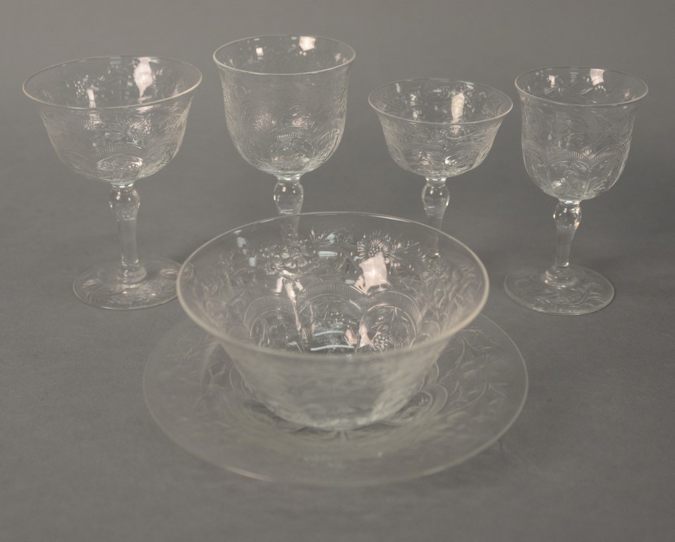 Webb Corbett, crystal etched dessert set, sixty-five total pieces to include eight bowls, twelve plates, eleven sherry stems, twelve port stems, eleven red wine, and eleven white wine. stems: ht. 4in. to 4 3/4in.