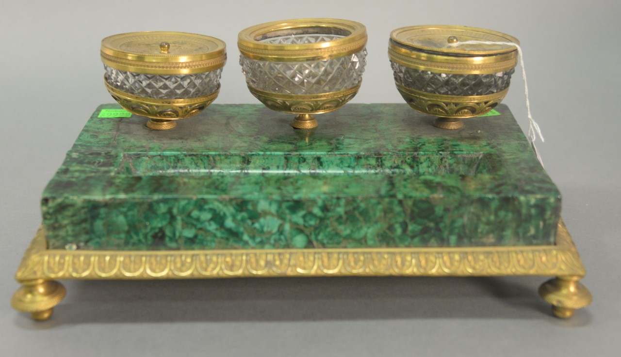 Louis XVI malachite and bronze Dore Encrier, oblong welled malachite plateau fitted with diamond cut crystal sander and two bowls mounted in bronze Dore.