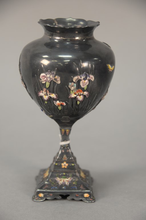 Pietra Dura black cigar box having lift top with cigar box having lift top with cigarette, cigar holder and matches with four floral sides in ebonized wood frame, interior with sixteen cigar holders. ht. 7 1/2in., top: 5 3/4 x 5 3/4