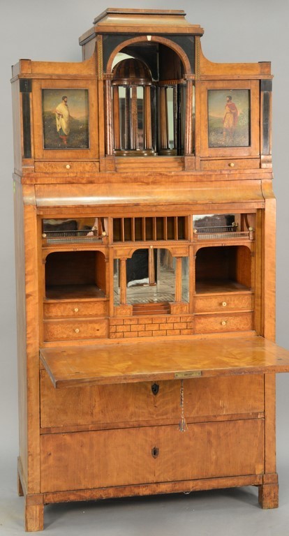 Biedermeier secretaire having mirrored top with inlaid dome and columns flanked by two doors with hand painted metal inserts over drawers over drop front opening to reveal inlaid compartments and several secret pullout areas over two drawers all set on plain square feet, circa 1815-1830.