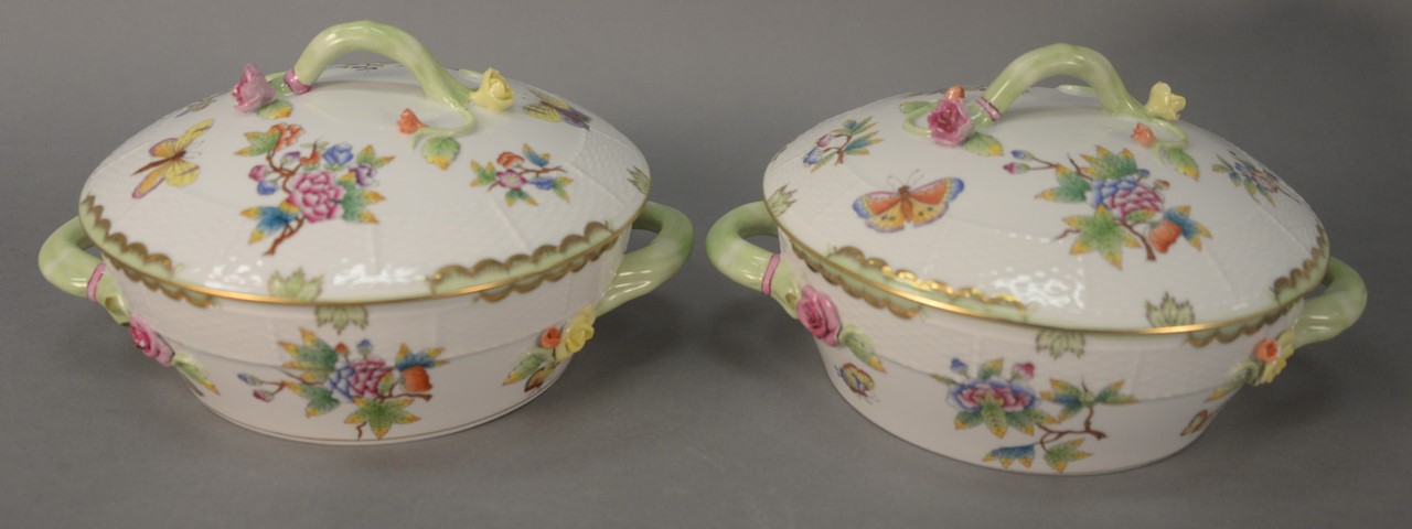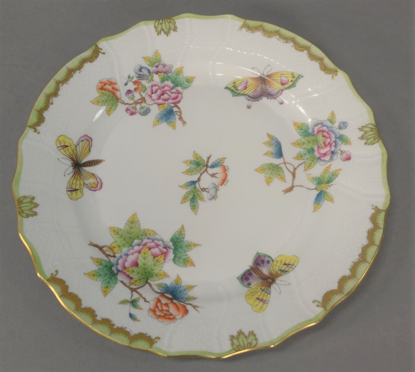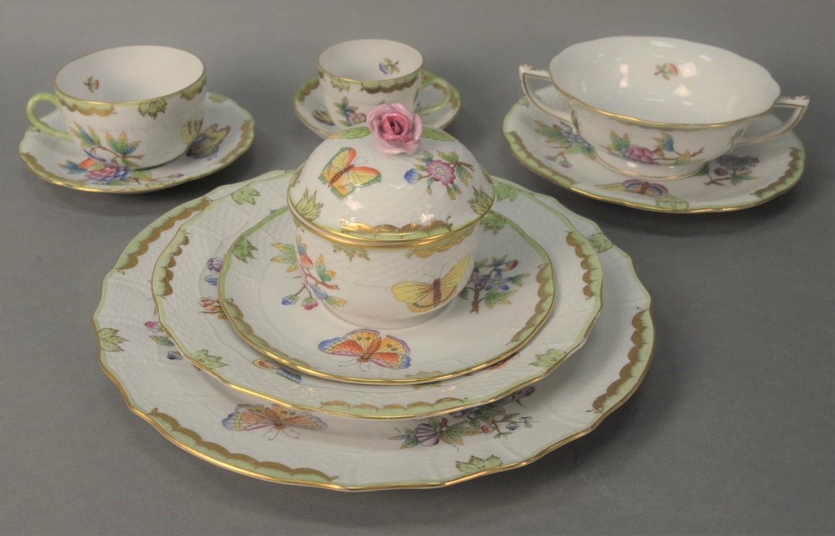 Herend Queen Victoria dinnerware set, 160 total pieces including 28 plates, 20 luncheon plates, 14 bouillon cups and saucers, 14 coffee cups and saucers, 14 tea cups, and saucers, 14 covered cups and saucers one covered cup is of smaller size.