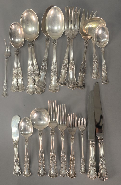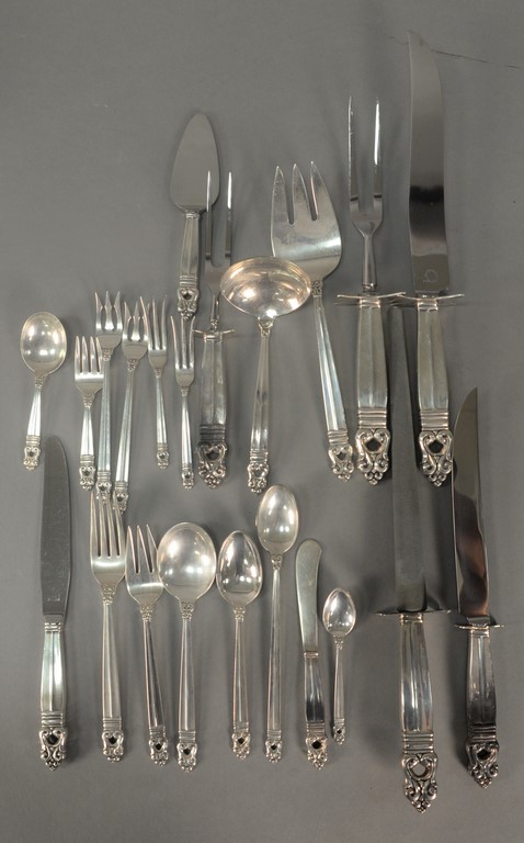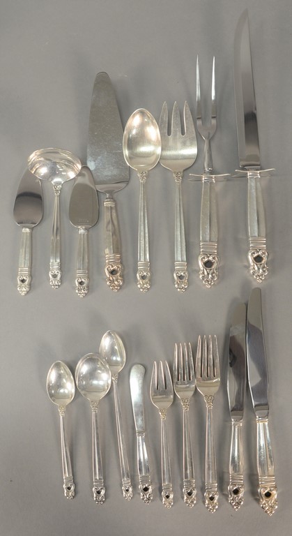 Georg Jensen sterling flatware set, serving for twelve, Cypress pattern Denmark, Tias Eckhoff b. 1926, 92 piece complete set to include 12 dinner knives, 12 dinner forks, 12 luncheon forks, 12 fish forks, 12 tablespoons, 12 teaspoons, 12 coffee spoons, 4 serving spoons, ladle, bottle opener, and pair of salad servers. total weight 96 t oz. plus 12 handles
