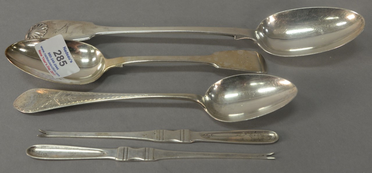 Five piece lot to include two silver marrow picks, and three large silver spoons, two English and one marked N. Dodge.