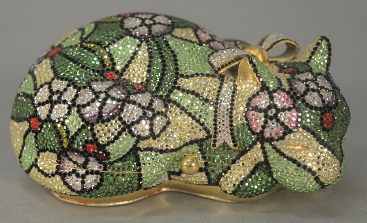 Judith Leiber jeweled crystal miaudiere purse Millie, the dog clutch having bright colored flower design and fitted with original mirror, comb, and shoulder strap.