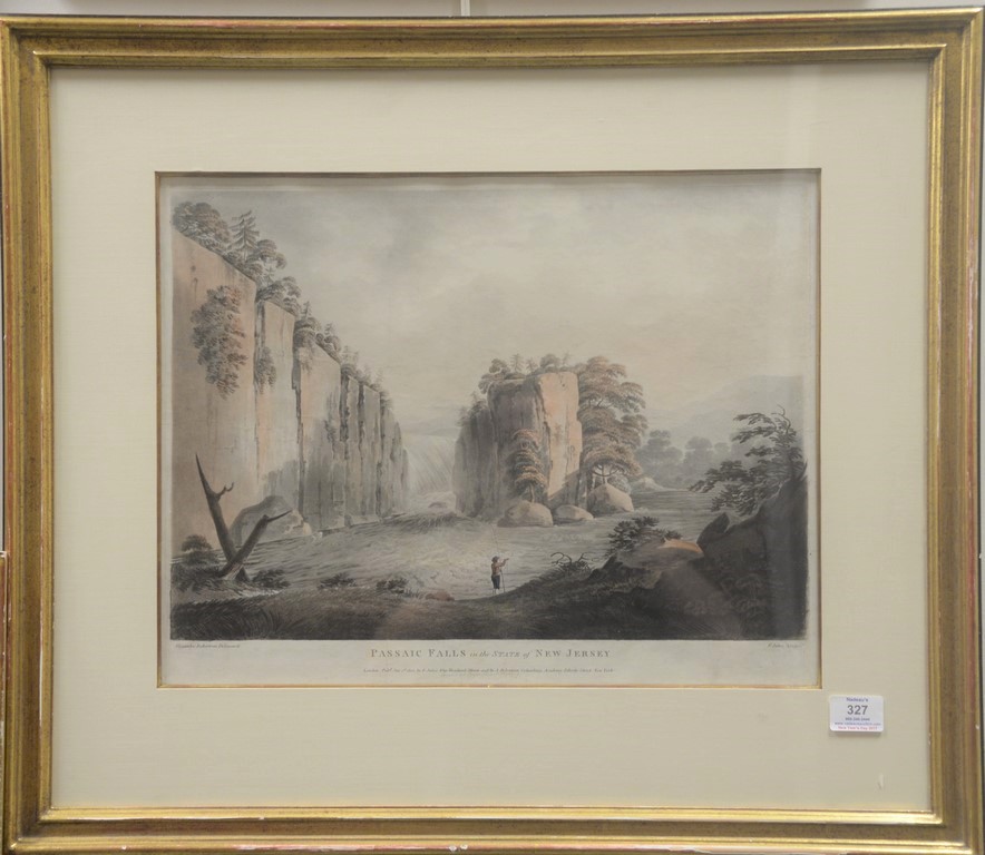 Francis Jukes 1747-1812 hand colored aquatint engraving After Alexander Robertson delineavit Passaic Falls in the State of New Jersey Published 1802 by F. Jukes New York sight size 14 3/4 x 19 Provenance: Property from Credit Suisse’s Americana Collection