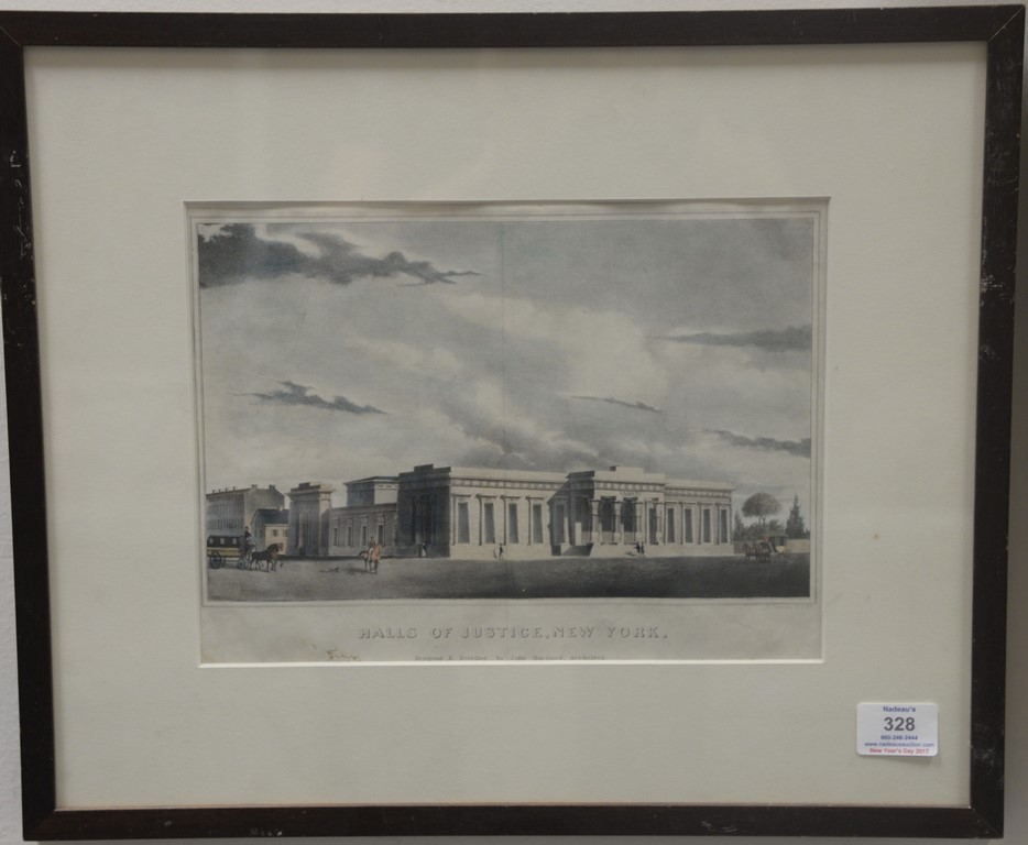 Nathaniel Currier colored lithograph Halls of Justice, New York Designed and Erecting by John Haviland Architect marked lower right: N. Currier Lith N.Y. sight size 8 3/4 x 11 3/4 Provenance: Property from Credit Suisse’s Americana Collection