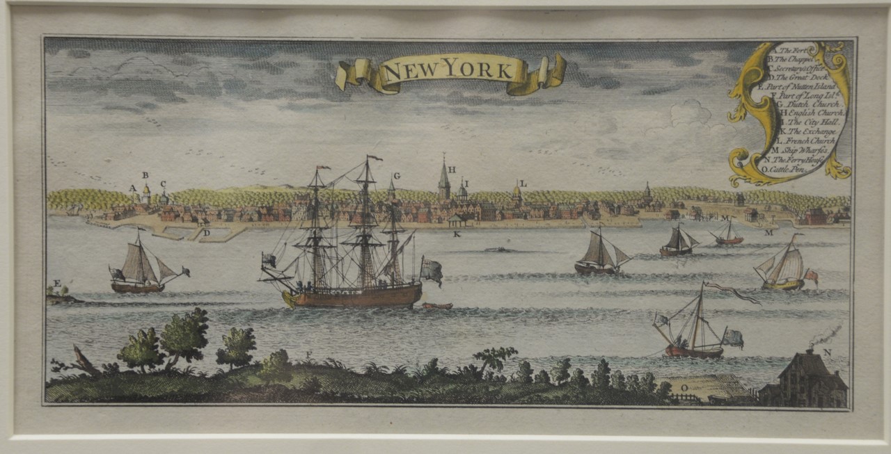 Covens Mortier New York hand colored engraving Derivative View, Keyed with Letters A-O corresponding to locations to places on the map. sight size 5 1/2 x 11 Provenance: Property from Credit Suisse’s Americana Collection