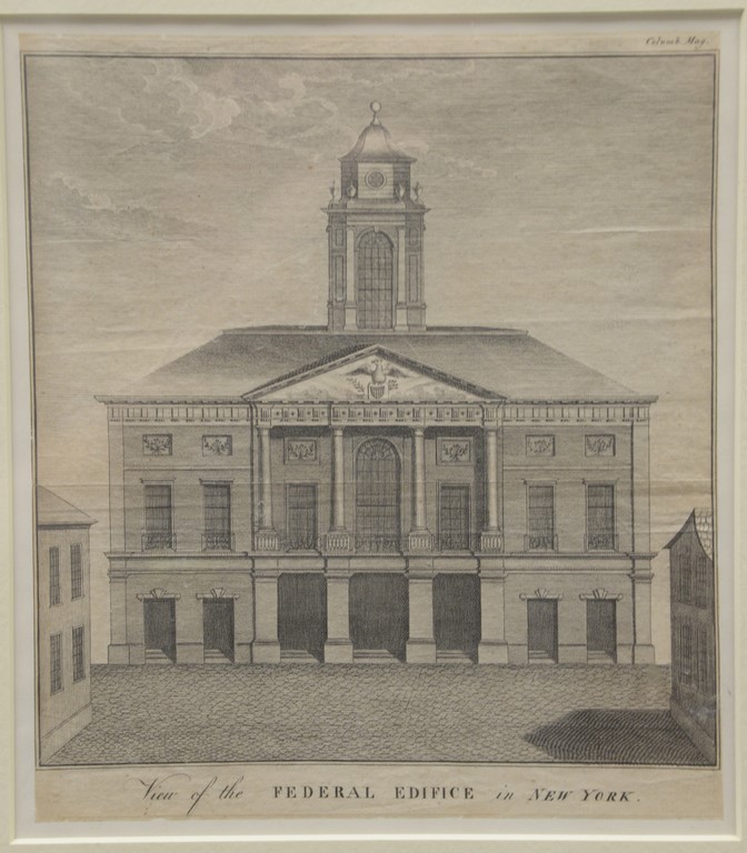 Rare copper engravings View of the Federal Edifice in New York From Columbian Magazine Philadelphia 1789 one is in the Library of Congress, The Columbian Magazine engraving precedes Amos Doolittles version of the building by a few months. sight size 9 x 8 Provenance: Property from Credit Suisse’s Americana Collection