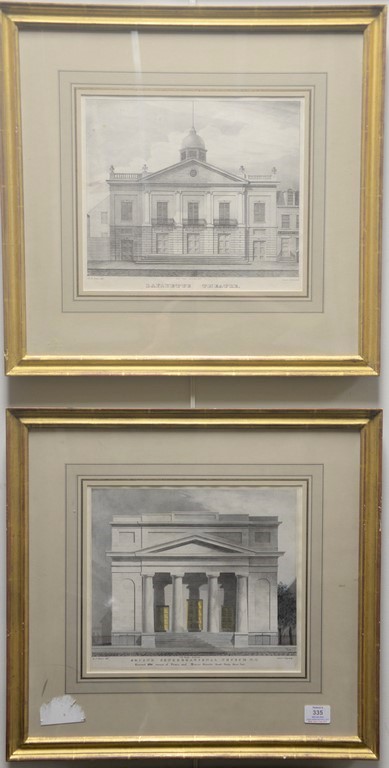 Pair of Architectural lithographs Anthony Imberts lithography After A.J. Davis 1 Lafayette Theatre Peter Grain Architect 1827 and 2 Second Congregational Church N.Y. erected 1826 corner of Prince & Mercer Streets – Front sixty three feet J.R. Brady Architect sight size 11 x 12 1/2 Provenance: Property from Credit Suisse’s Americana Collection