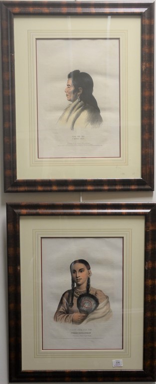 After Charles Birdking 1785-1862 pair of hand colored lithographs from History of the Indian Tribes of North America Rant-CHE-WaI-M Female Flying Pigeon published by E.C. Biddle and Sha-Ha-Ka A Mandan Chief published by Biddle sight size 17 x 12 Provenance: Property from Credit Suisse’s Americana Collection