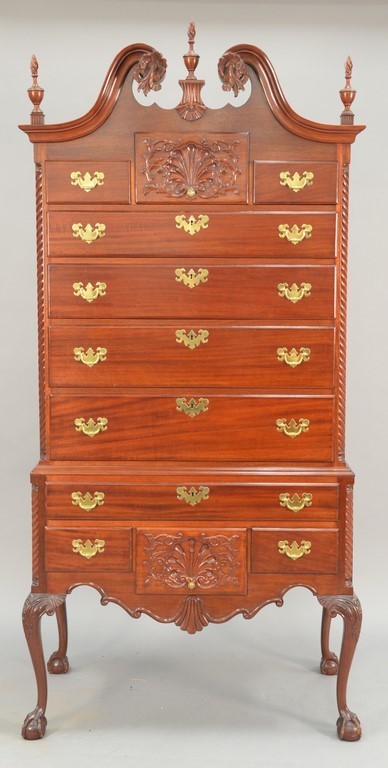 Fineberg mahogany Chippendale style highboy in two parts, upper portion with broken arch top over three over four drawers on lower portion with one long drawer over three drawers with scalloped apron set on carved cabriole legs ending in ball and claw feet, all flanked by spiral columns.