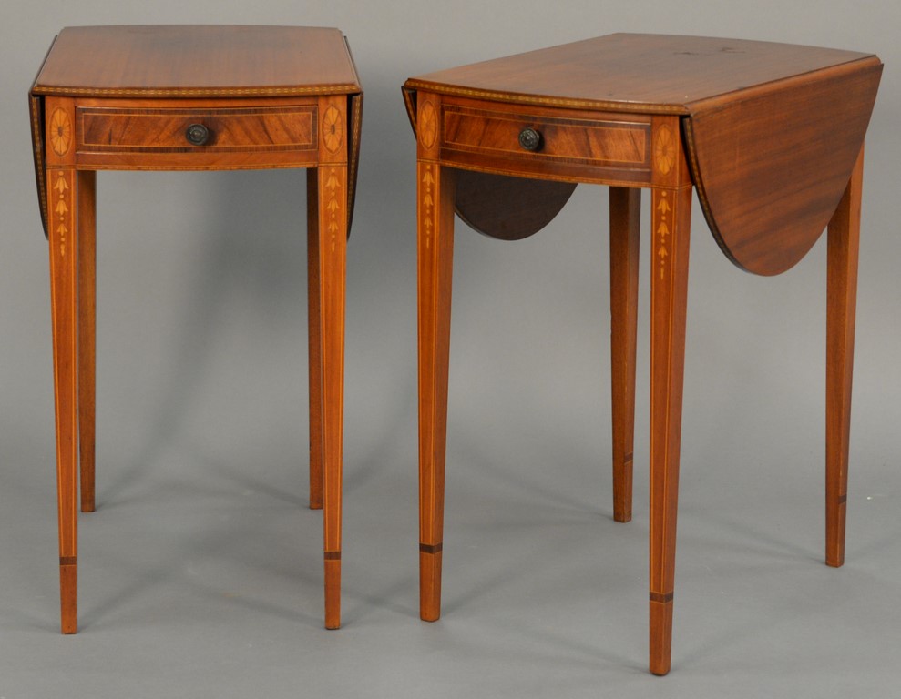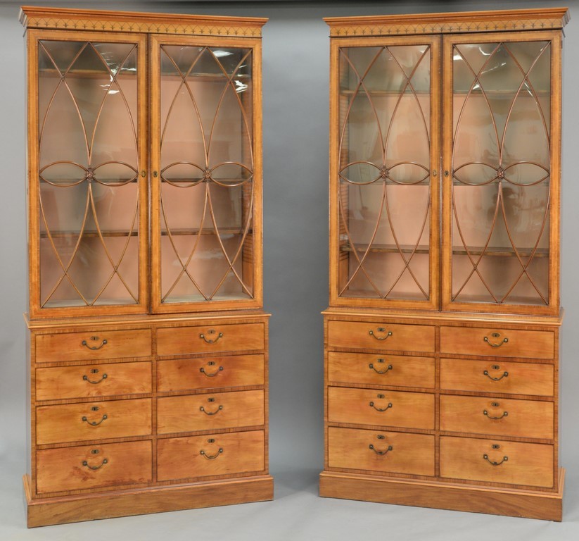 Pair of George III satinwood and tulipwood marquetry bookcase cabinets in two parts, upper portion with cornice molded top over gothic inlaid frieze above glazed doors with shelved interior on lower portion with eight short drawers over plinth base. Possibly by Gillows, circa 1790.