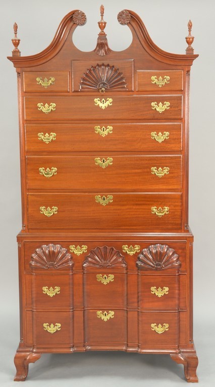Fineberg mahogany chest on chest in two parts, upper section with broken arch top over three short drawers over four drawers on lower section with triple shell carved block front of three drawers, all set on ogee feet.
