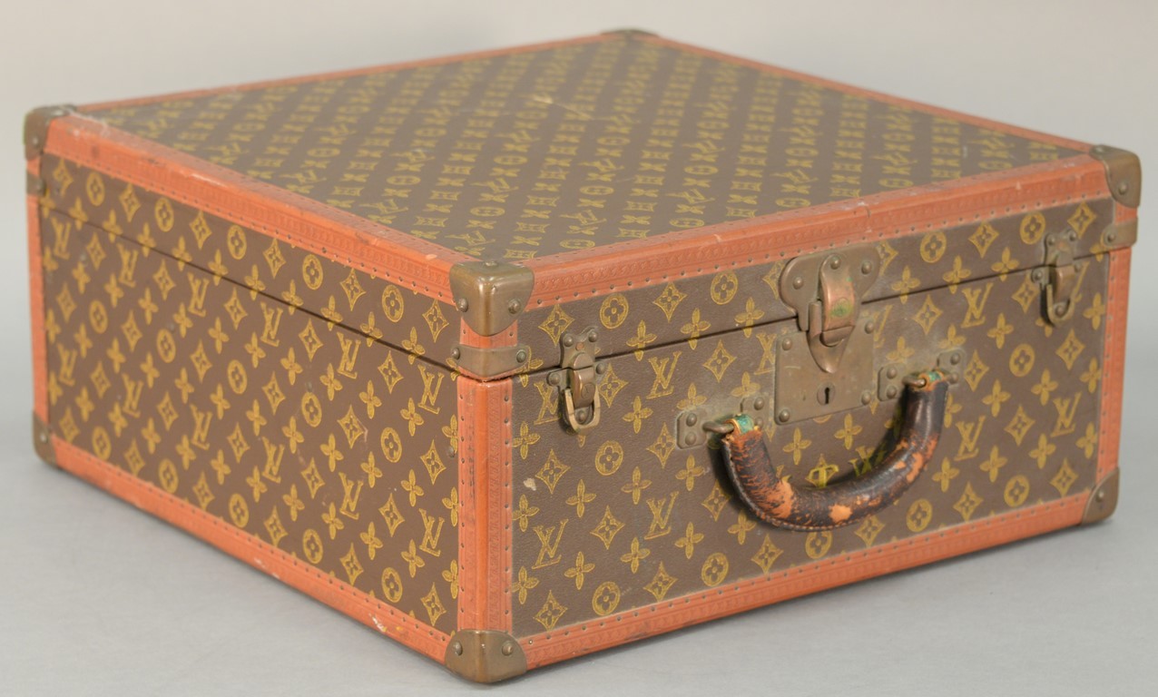 Louis Vuitton monogram suitcase, hard shell exterior with leather corners and tray insert interior with paper label on inside: Louis Vuitton 834649, Paris 70 Champs Elysees 149 New Bond St. London. torn back 19 3/4 x 17 1/2 x 8