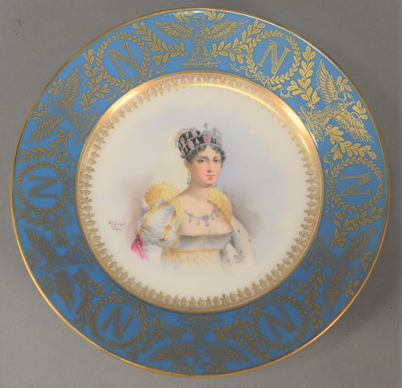 Set of ten Sevres Napoleonic plates, each with portrait medallion centered on blue ground with extensive gilt highlights of of eagle and capital N, to include Hortense de Beauharnais Reine de Hollande, Caroline Murat Reine de Naples, Roi de Rome, Elisa Bonaparte Duchesse de Toscane, Pauline Bonaparte Princess Borghese, Imperatrice Marie-Souise, Louis Bonaparte Roi de Hollande, Murat Roi de Naples, Imperatrice Josephine, and Jerome Bonaparte Roi de Westphalie, each plate signed G. George & Sevres on front and M. Imp de Sevres on back with gilt mark.
