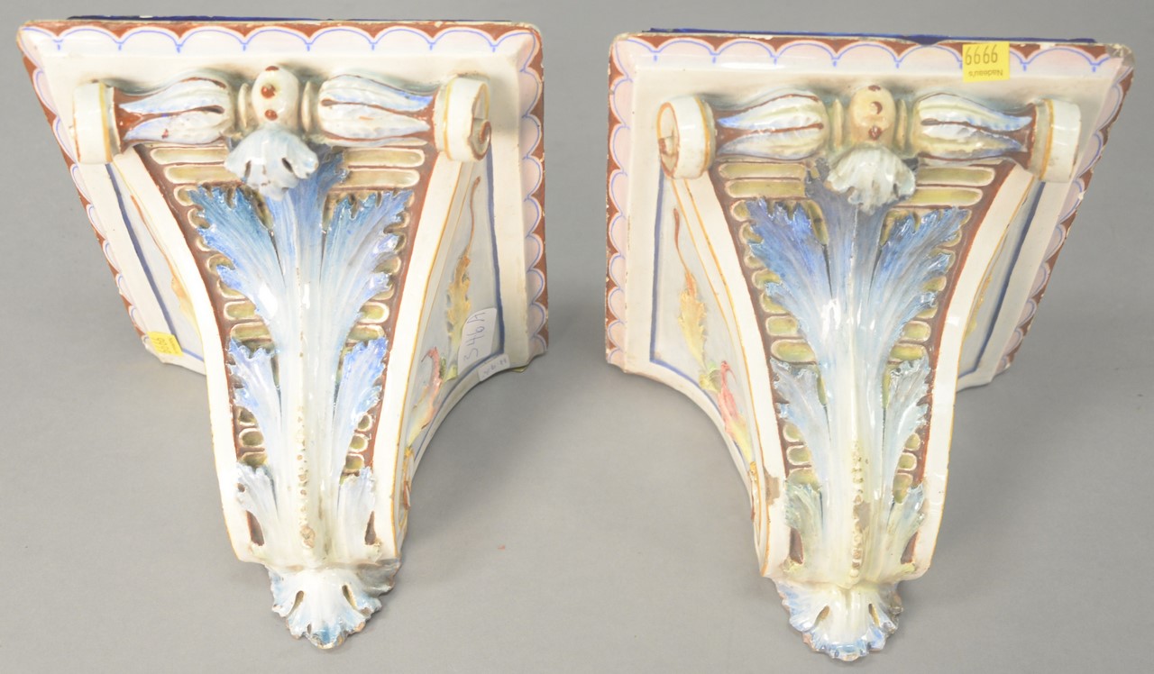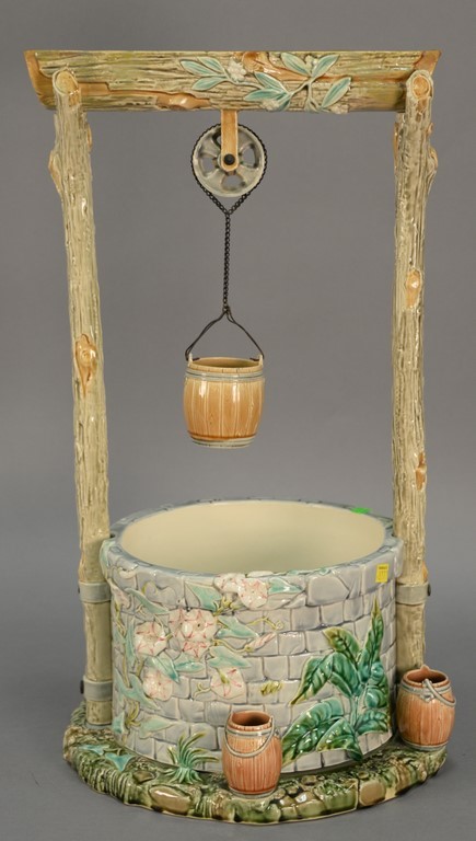 Hautin & Boulenger Choisy Le Roi Faience Majolica three part well, painted and decorated with molded grass and leaf, log form cross member with wheel holding buck on a chain, supported by two three form branches over large well on round base with barrels. top log professionaly repaired ht. 26in., wd. 14 1/2in.