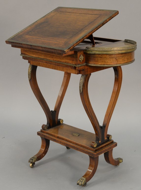 Regency rosewood and mahogany brass inlaid work table, rectangular hinged top having brass inlaid edges resting on ratchet support and slide to reveal leather backgammon well flanked by hinged demilune brass trimmed compartments on frame with scrolled supports joined by stepped shelf on four downswept members with brass paw feet, first quarter 19th century.