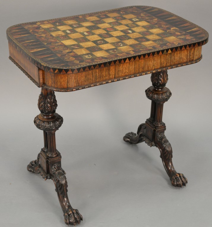 George IV parquetry inlaid faux specimen wood and rosewood games table with inset leather game board with two different crests and coronets, one drawer on either end opening to reveal chip slots over carved edge on acanthus vase and fluted double supports set on downswept acanthus carved members ending in paw feet and casters. Attributed to Gillows, circa 1825. ht. 29 1/4in., wd. 30in., dp. 21in.