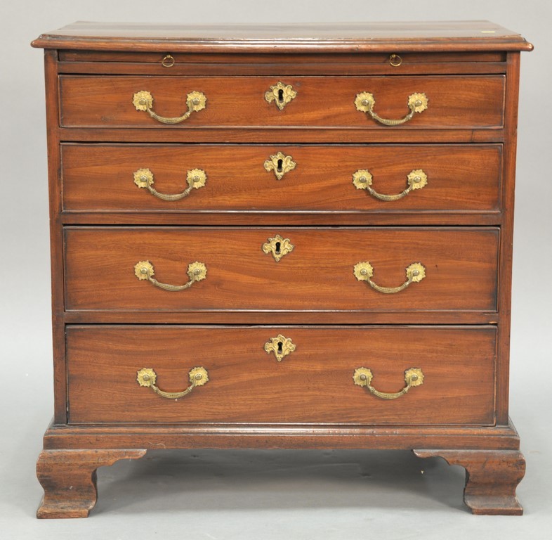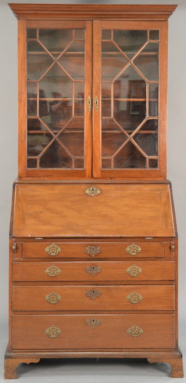 George II mahogany secretary desk in two parts, upper portion with cornice molding over glazed doors on lower section with slant lid over four drawers on bracket base, interior with multi-drawer, columns, and leather writing surface, 18th century. ht. 86in., wd. 38 1/2in., dp. 21in.