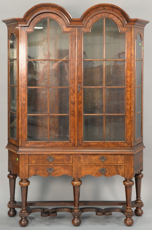 Dutch burlwood cupboard in two parts, upper section having double arched top over two arched glazed doors flanked by arch top side panels all set on base with four drawers on turned legs, 19th century. ht. 84in., wd. 56in., dp. 15in.