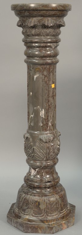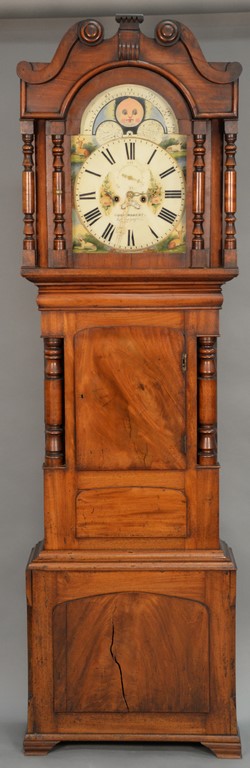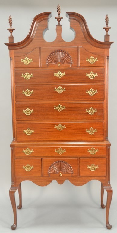Margolis mahogany highboy in two parts having a full bonnet top with three finials over three short drawers over four long drawers on lower section with one long drawer over three short drawers, flanked by fluted columns all set on cabriole legs ending in pad feet, two center drawers with fan carvings, signed on reverse: Margolis 1932. ht. 83in., wd. 38in., dp. 20in.