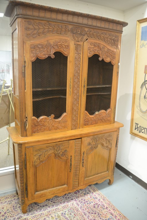 Louis XV fruitwood cabinet in two parts, upper section with carved cornice molding and floral carved top section over two grillwork doors on lower section with two carved doors flanked by carved columns, 18th century.