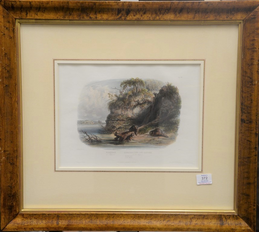 After Charles Karl Bodmer 1809-1893 Set of four hand colored aquatint engravings 1 Wald-Ansicht Am Tobihanna, Forest Scene on the Tobihanna Alleghany Mountains, by I. Weber 2 Tower Rock View of the Mississippi, by John Outhwaite 3 Punka Indians Encamped on the Banks of the Missouri, by Salathe 4 Beaver Hut on the Missouri sight size 9 1/4 x 12 1/2 to 11 x 14 Provenance: Property from Credit Suisse’s Americana Collection