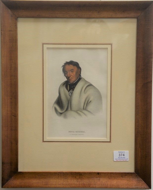 After J. T. Bowen set of four hand colored lithographs from The Octavo Edition of the History of the Indian Tribes of North America 1 Meta-Koosega, a Chippeway Warrior 2 Ong-pa-ton-Ga 3 Tshi-Zun-Hav-Kau 4 Mistippee sight size 9 x 6 Provenance: Property from Credit Suisse’s Americana Collection