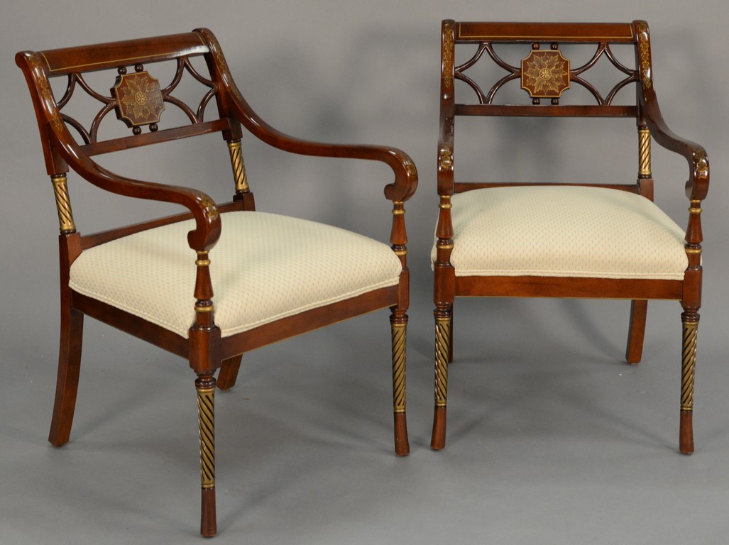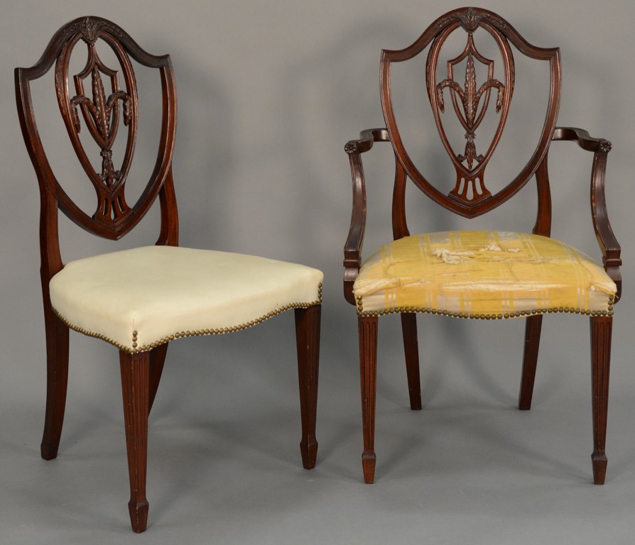 Set of six Margolis Federal style dining chairs having shield backs with carved plume, four including one armchair and five side chairs, four with leather upholstered seats and two with cloth. ht. 39in.