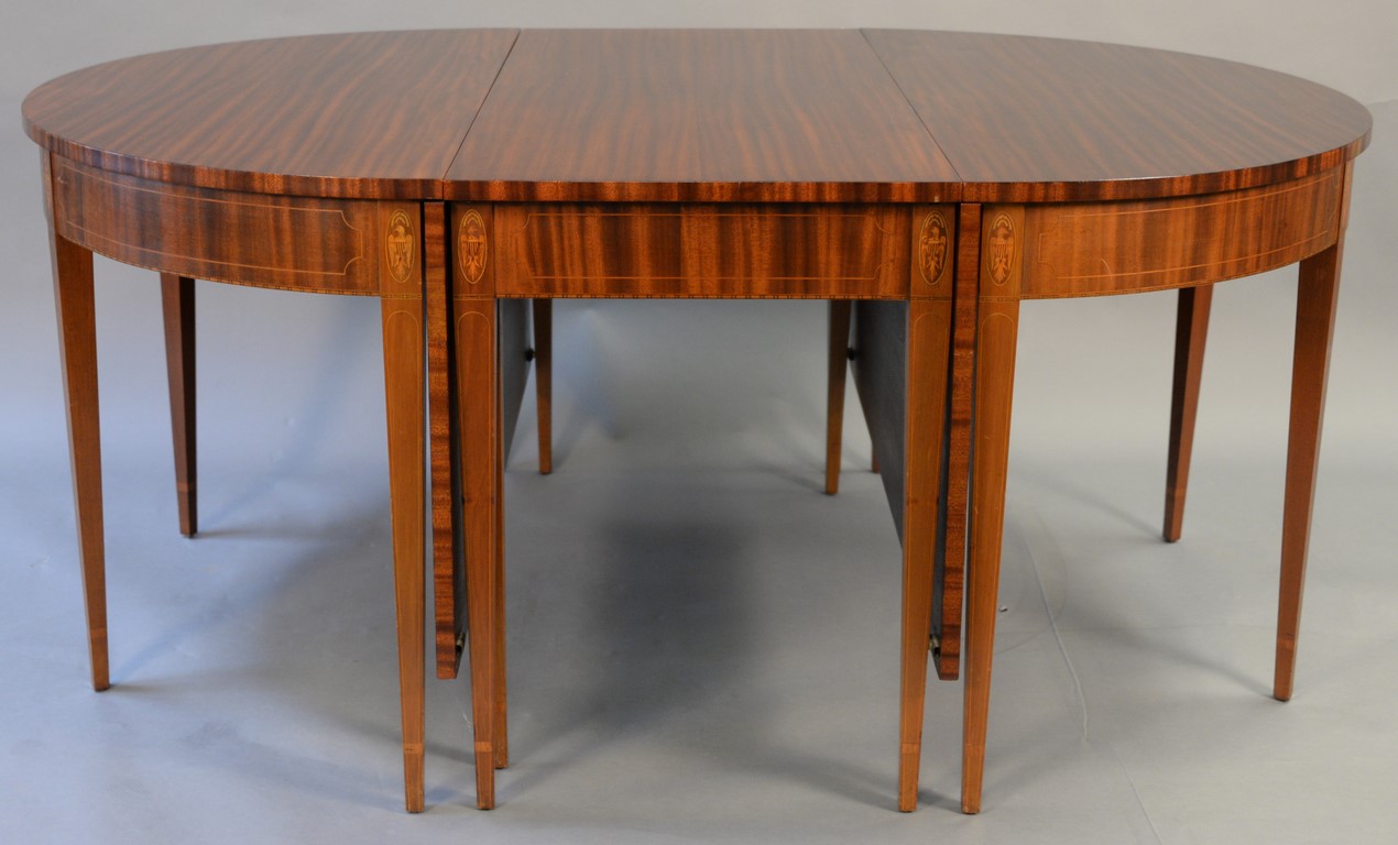 Custom mahogany Federal style three part dining table having central drop leaf table and two demilune ends all set on square tapered legs, all with inlaid eagles and lines, includes pads. ht. 30in., top closed: 48 x 70, top opened: 48 x 114
