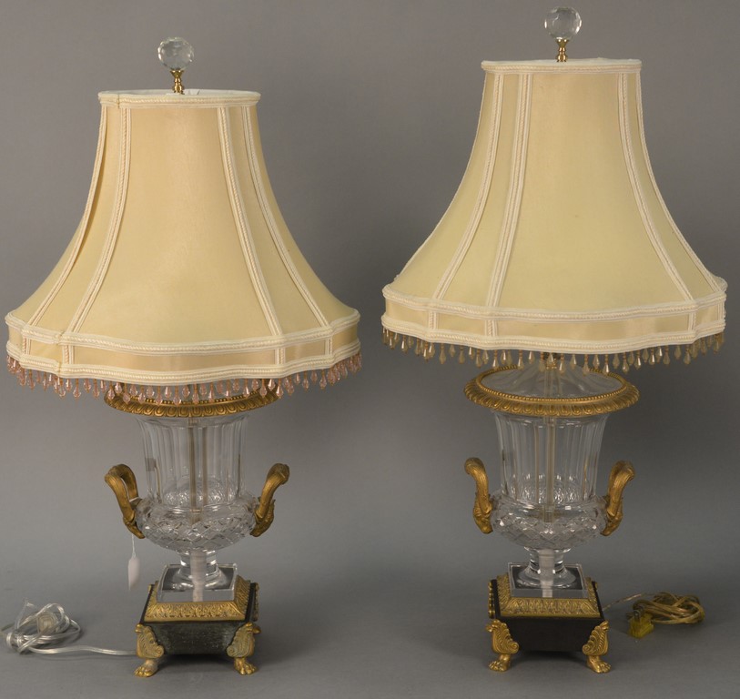 Pair of French Empire style crystal bronze mounted urns made into table lamps, having crystal cover with bronze rim over diamond cut body mounted with ram’s head handles on claw foot base, possibly Baccarat. urn ht. 15in., total ht. 29in.