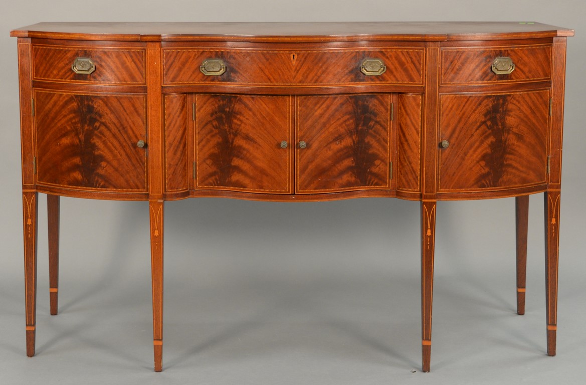 Margolis mahogany sideboard having serpentine top over conforming case with three drawers over four doors all set on square tapered legs with line and bellflower inlay, Margolis stamp on back.