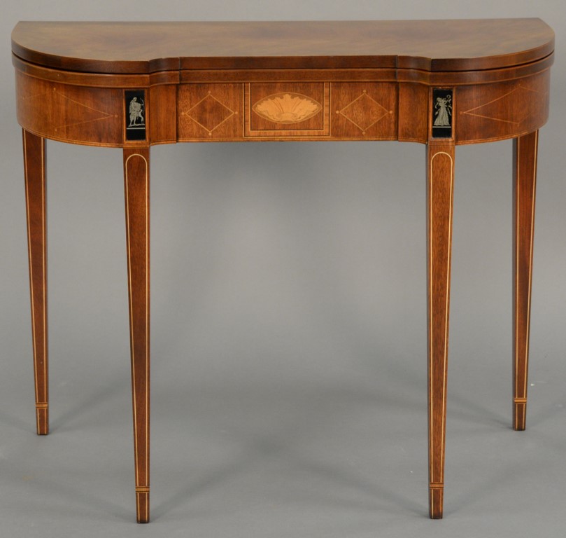 Baker mahogany game table with shaped top over conforming frieze having inlaid glass panels all on square tapered legs in the manner of Baltimore Style.