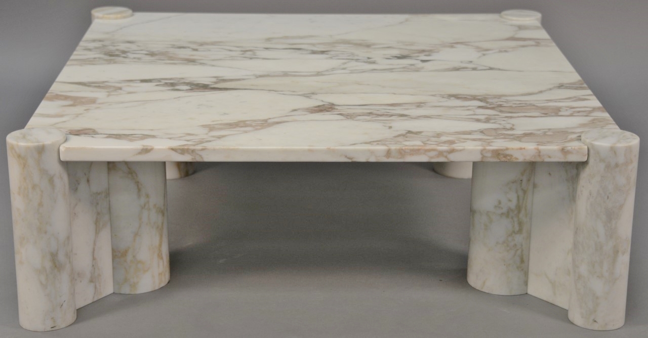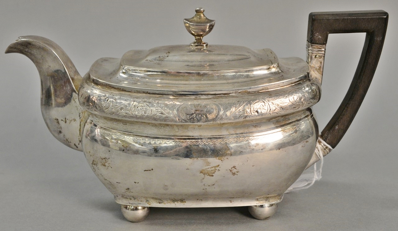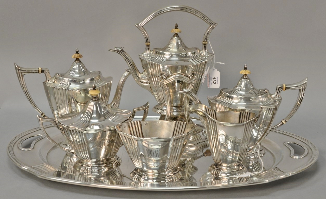 Brand-Chatillon & Co. seven piece sterling silver tea and coffee set including large tray, tilting pot on stand, coffee pot, teapot, sugar, creamer, and waste bowl.