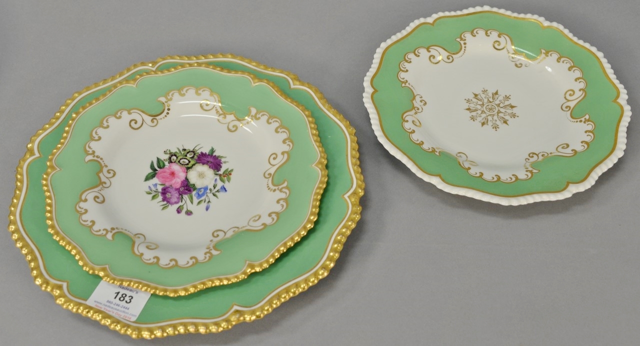 Flight Barr & Barr lot including compote and two plates with coat of arms, seven dinner plates Flight Barr & Barr and Royal Worcester, four piece lot including square dish and three plates Flight Barr & Barr with birds, eight Flight Barr & Barr lunch plates, two Flight Barr & Barr scenic plates, six Flight Barr & Barr lunch plates with flowers, ten cups and eight saucers – some are Flight Barr & Barr including one large scenic cup and saucer. fifty total pieces.
