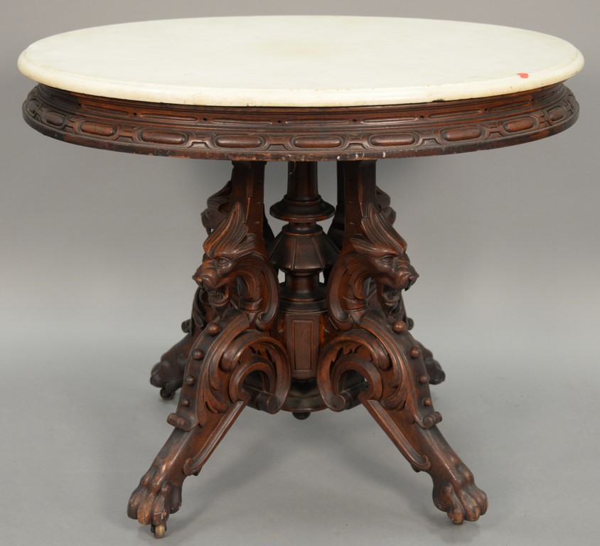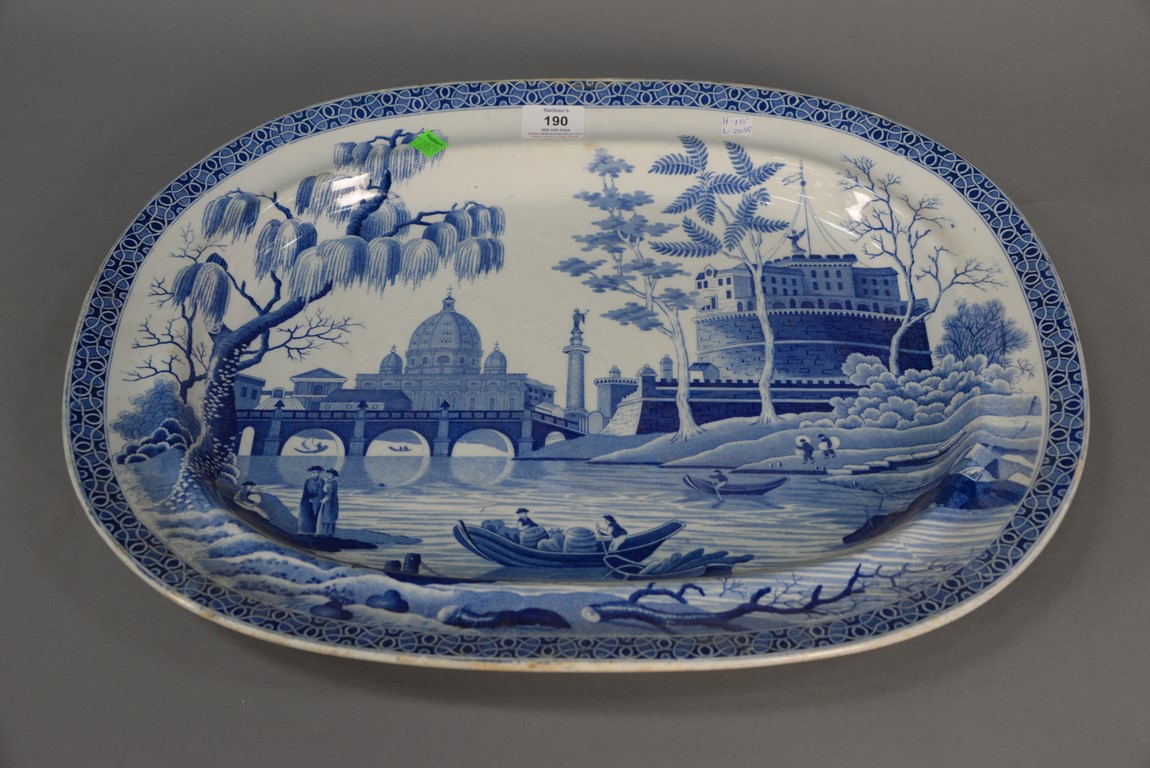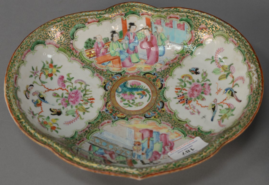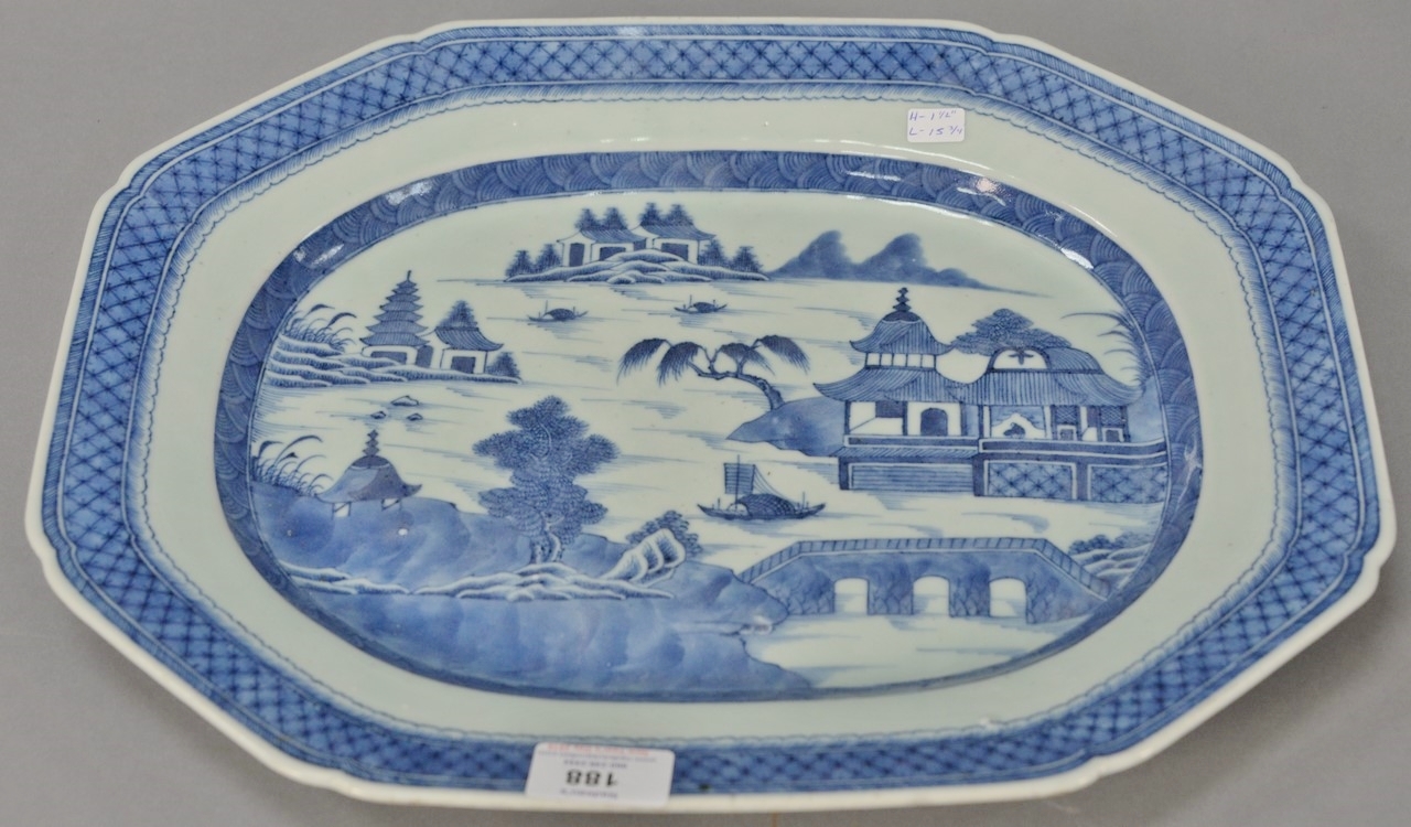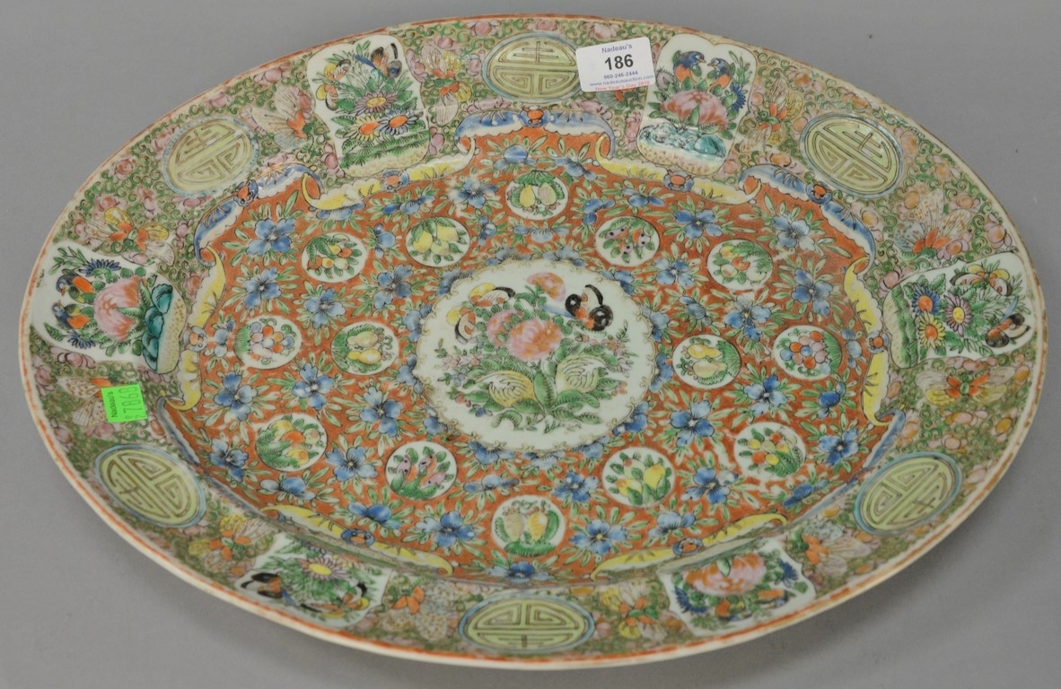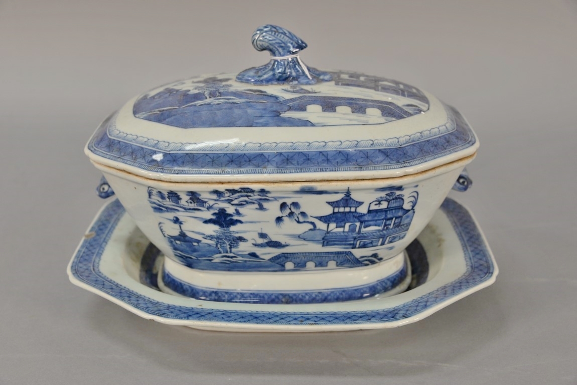 Canton covered tureen plus platter, tureen with boar head handles platter with chips. tureen: ht. 8 1/2 in. lg. 12 1/2 in. platter: lg. 14 in. wd. 11 in.