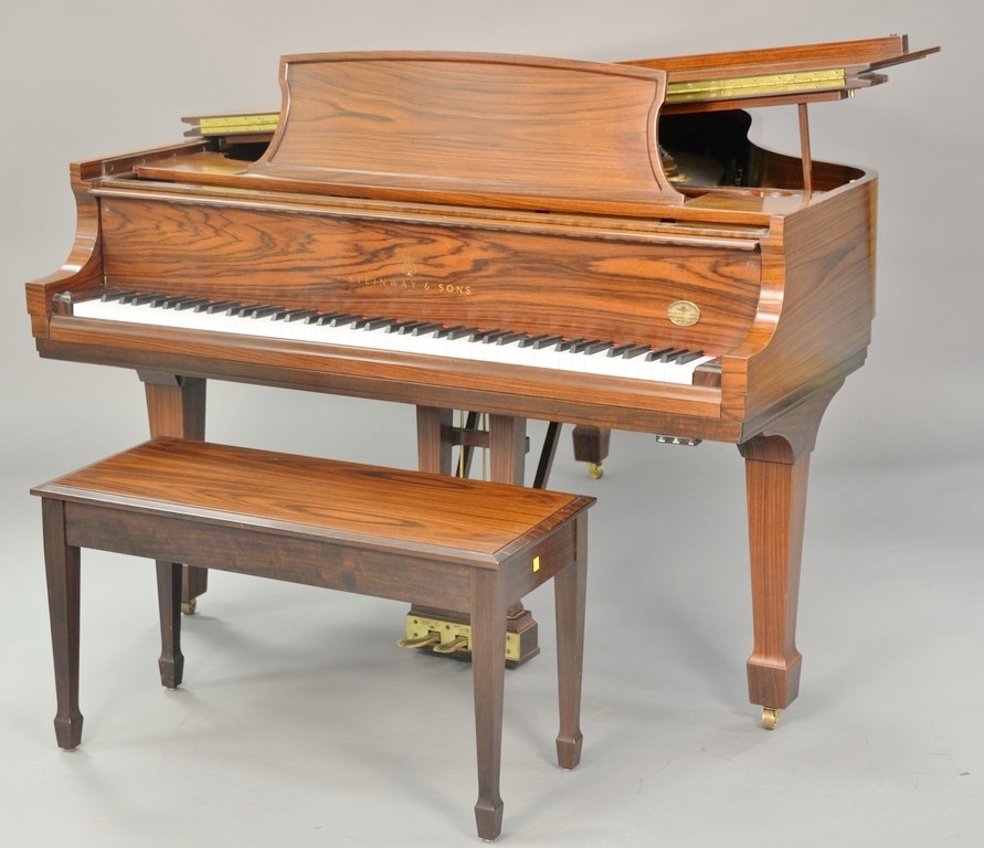 Steinway & Sons East Indian Rosewood Grand Piano Model L The Crown Jewel Collection, East Indian Rosewood case with high gloss finish, accelerated action hexagrip pinlock diaphragmatic soundboard, serial number 533221 with matching piano bench, excellent condition with damp-chaser dual automatic humidistat for grand piano’s humidifier dehumidifier. lg. 5′ 10