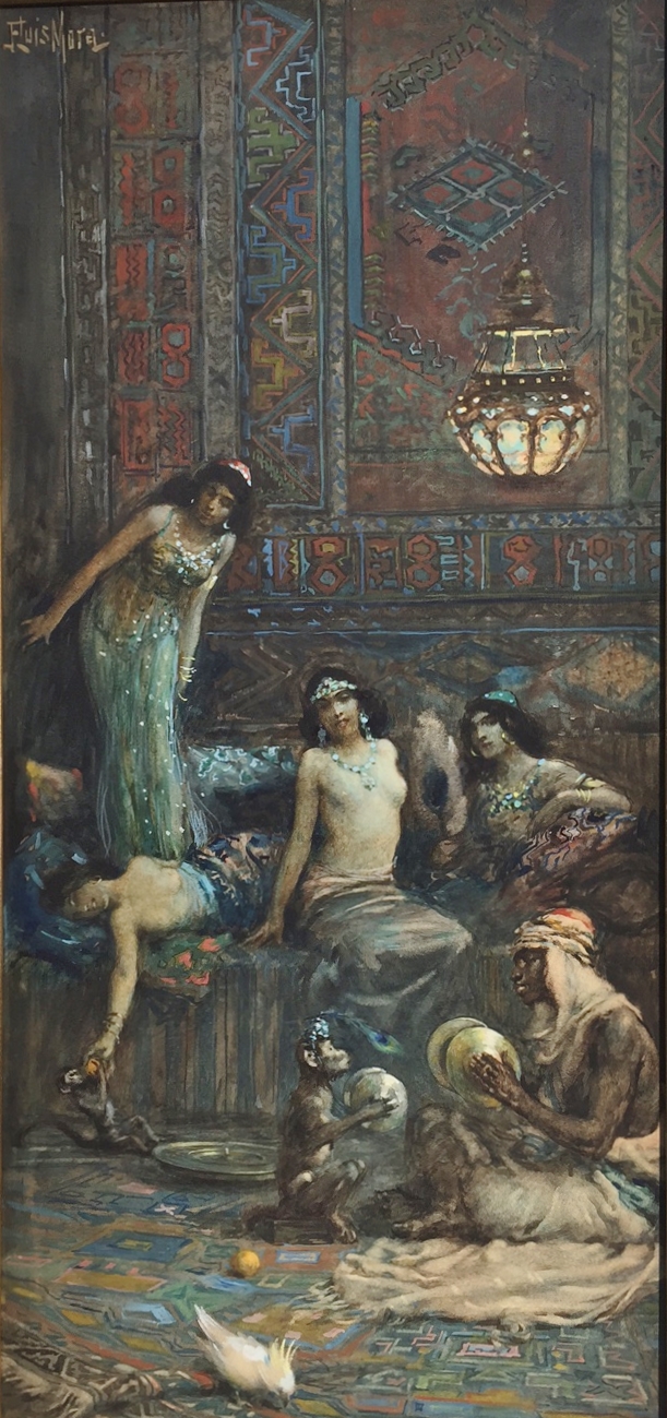 Francis Luis Mora 1874-1940 Oriental Interior Scene Arabian Pastime watercolor / gouache on paper signed top left: F. Luis Mora sight size: 19 1/4 x 9 1/4 Frederick Baker label on verso A very rare Orientalist painting by one of Connecticuts favorite early 20th century artists.This painting was painted on one of Moras trips to Spain to visit his extended family in the first years of the last century.Mora often liked to paint what was popular at the time he visited Spain.In later years he even dressed like a 8th century Spanish painter when he painted in his Connectiicut studio.In 1910 Mora had a one man show at the Watercolor Club of New York.This painting was in that exhibit and is the only Orientalist painting he seems to have painted.