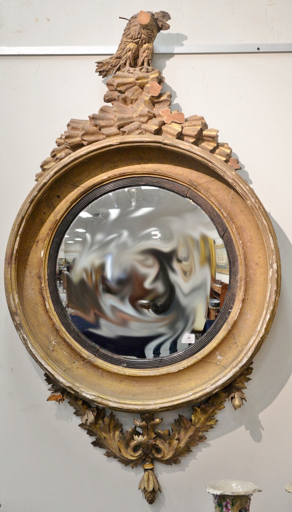 Large Girandole mirror having eagle atop round convex mirror over scroll leafy base, circa 1840 most loose parts are available including head, a full wing, and part of other wing. total ht. 58 in. glass dia. 20 in. Provenance: The Estate of Natalie Rafferty