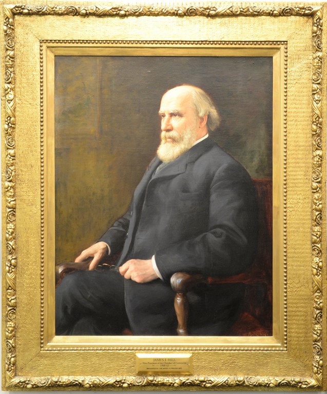 Adolfo Muller-ury 1862-1947 Portrait of James Jerome Hill 1838-1916 oil on canvas, circa 1902 signed lower right: Muller-ury plaque: James J. Hill, Vice President of the Chamber of Commerce 1908-12, Presented by the artist A. Muller-ury. 42 1/2 x 34 total size: 57 1/4 x 48 1/2 Hill was a Canadian-American railroad executive, the Chief Executive Officer of lines headed by the Great Northern Railway, and President of St. Paul, Minnesota & Manitoba Railway Company. Provenance: Property from Credit Suisse’s Americana Collection