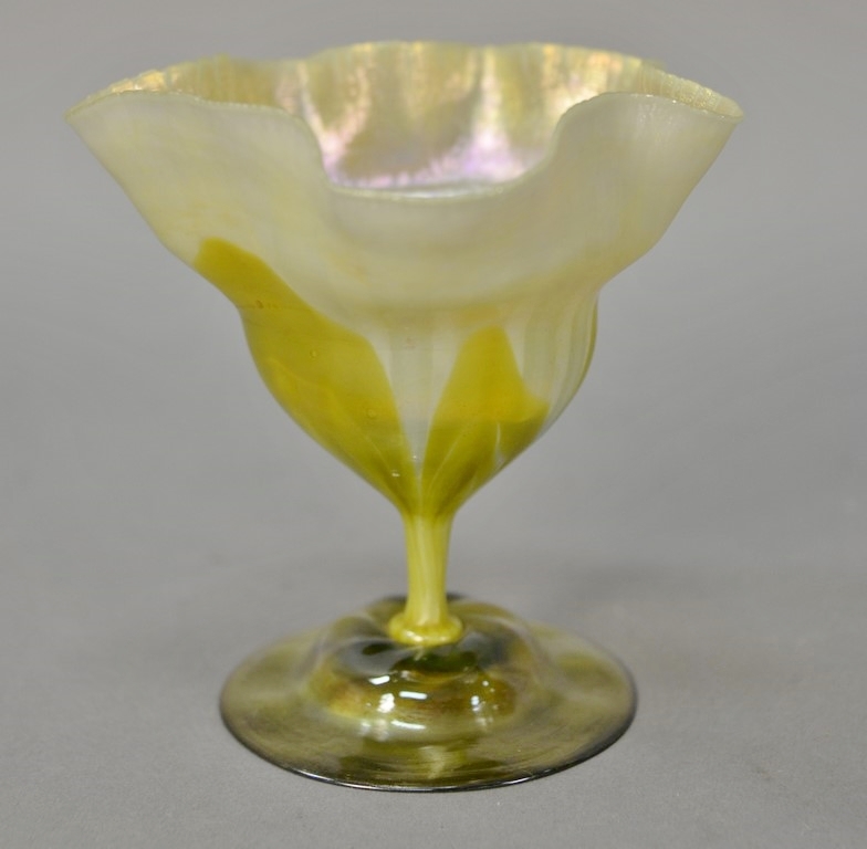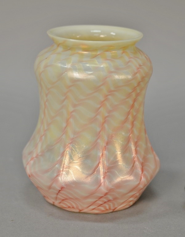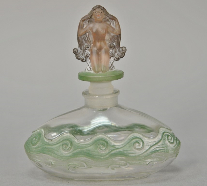 Perfume Dubarry bottle by J. Viard and made by Depinoix, clear wide shape molded overall with repeating wave and multi-color patina, stopper having figural frosted kneeling nude figure, bottom marked: made in France, circa 1920’s. ht. 3 1/2in.