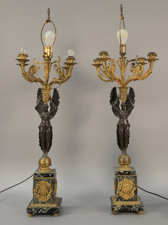 Pair of French ormolu bronze and rouge marble six light candelabras, each with classically draped winged figure of Victory standing on a sphere holding a vase with central torch flanked by scrolling branched candleholders, originally from Samuel Marti three piece clock set made into table lamp. lamp ht. 31 3/4in. total ht. 42 1/4in.