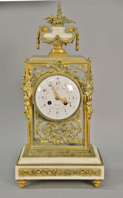 Wehrle French bronze, marble, and crystal mantle clock having porcelain dial marked Wehrle Bruxelles, brass works marked Madaille D’Argent, having starburst pendulum.