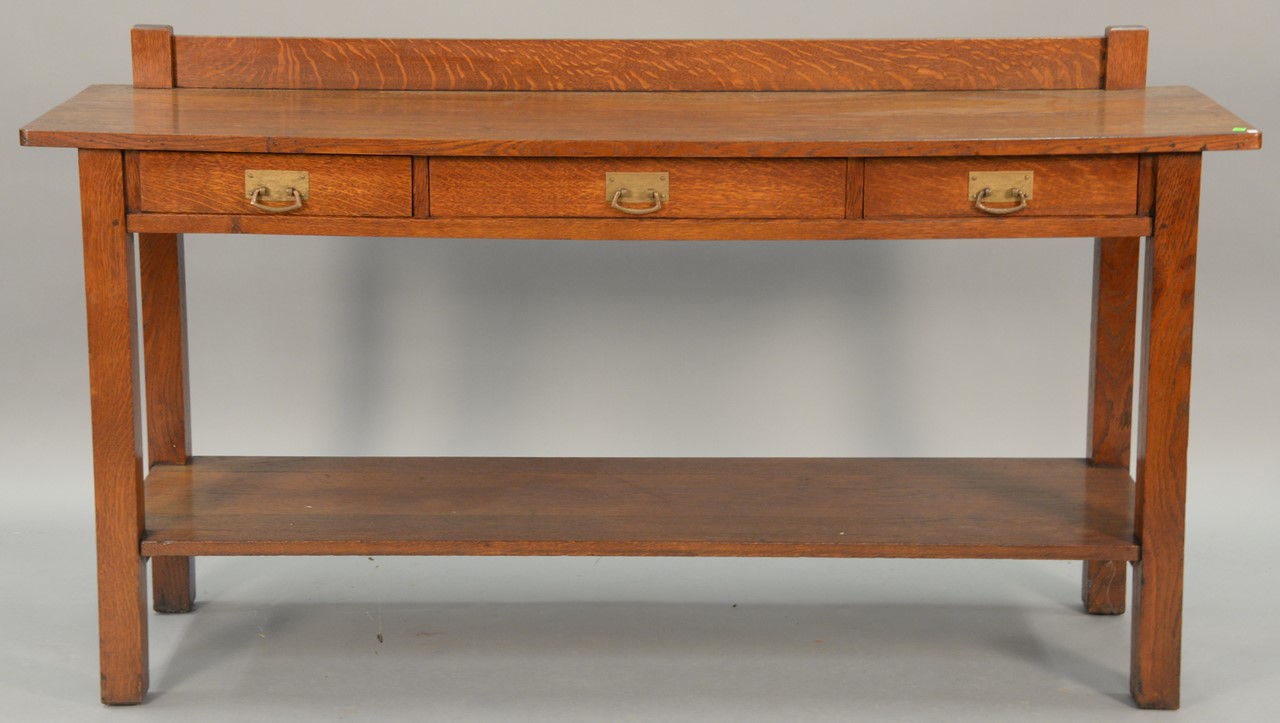 Mission oak server with backsplash having rectangular top over three drawers with hammered copper pulls over shelf, all set on squared legs.