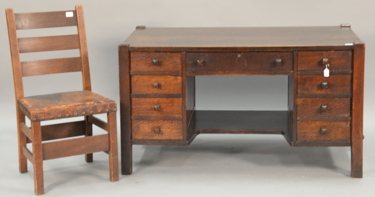 Gustav Stickley Mission oak two piece lot including desk and chair, desk with original pulls and original finish and a side chair with three slat back and original leather seat marked with impressed tool mark, original finish.